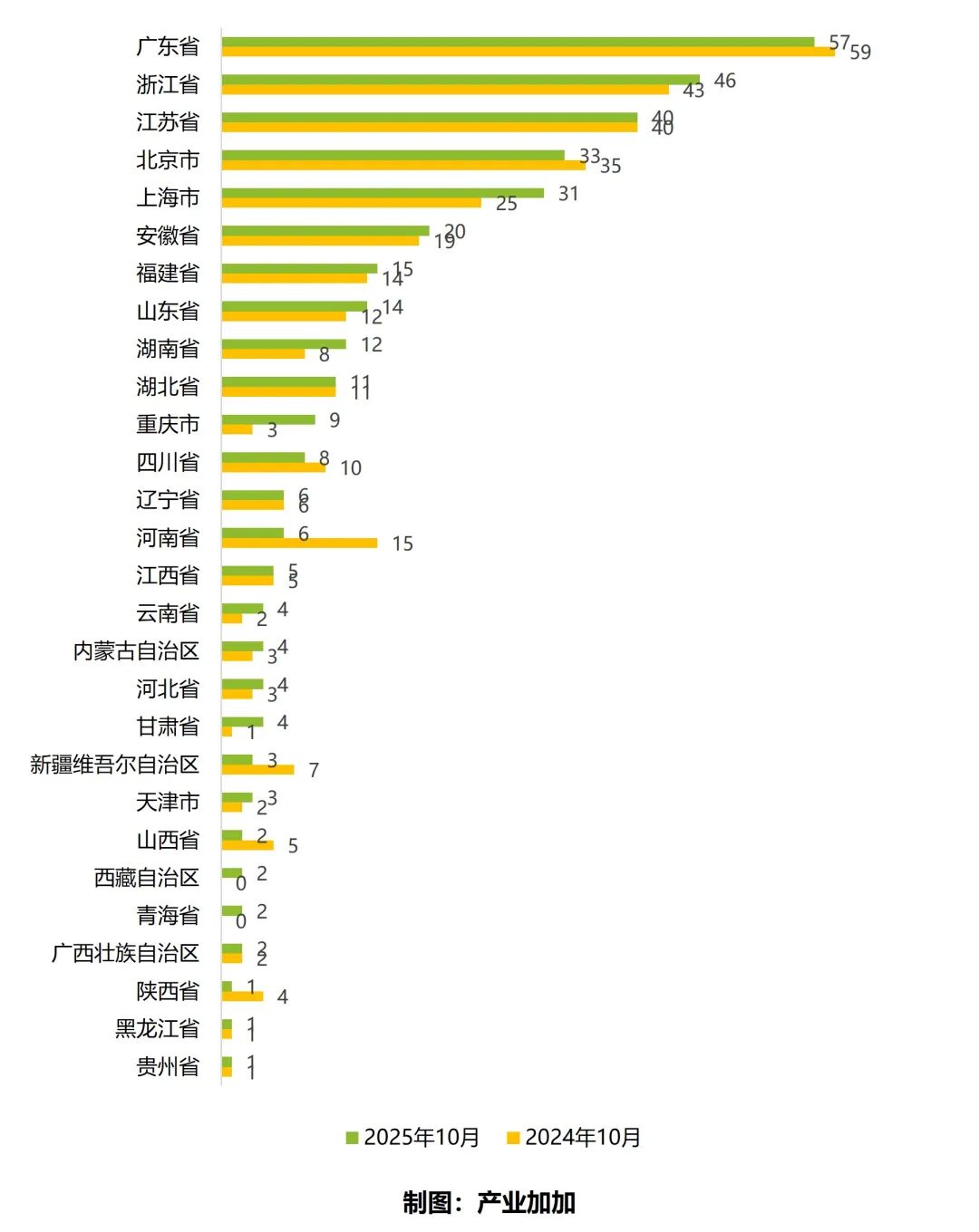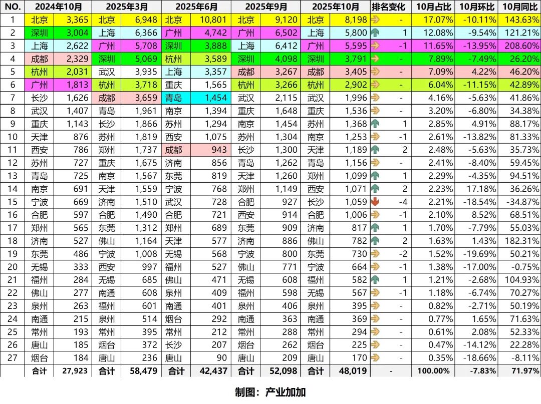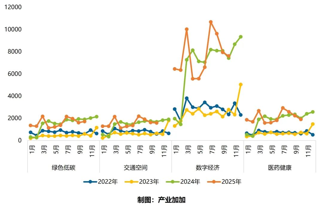 摘要 2025年10月,全国投资活跃度环比调整趋缓,累计规模持续高位扩张。在城市层面,10月万亿GDP城市投资活跃度回落,北京稳居榜首,西安环比领涨,长沙同比下滑最多。重点城市四大航道方面,深圳、上海四大航道投资活跃度均进入前五名,深圳数字经济领域全国第一,绿色低碳、交通空间、医药健康领域全国第二;上海交通空间、医药健康领域全国第一;杭州数字经济领域全国第二,绿色低碳领域全国第三;成都数字经济领域全国第三;广州数字经济、医药健康领域全国第四。其他城市在单一赛道表现亮眼,如北京在绿色低碳领域排名第一,重庆在绿色低碳领域排名第四。 2025年10月,发生对外投资的上市企业共有346家,相较去年同期(339家)增长2.1%,主要集中在长三角、珠三角和北京市地区。本月发生对外投资的上市企业数量同比变化有较大分化,前五省份中广东省和北京市本月发生对外投资的上市企业数量同比呈现小幅减少,浙江省和上海市本月发生对外投资的上市企业数量同比小幅增长外,江苏省保持不变。上市企业共对外投资481家企业,投向29个省份,子公司有409家,分公司有72家,长三角、北京、珠三角获投热度高,湖北省本月因开设64家分公司,占据对外投资省份榜首。 2025年10月产业情报大数据监测情况如下:从监测到的23,682条数据中,整理筛选出关键热点信息213条,其中招商热点21条,月度要闻192条。 附件文件 数据分析 2025年10月,全国投资活跃度环比调整趋缓,累计规模持续高位扩张。在城市层面,10月万亿GDP城市投资活跃度回落,北京稳居榜首,西安环比领涨,长沙同比下滑最多。重点城市四大航道方面,深圳、上海四大航道投资活跃度均进入前五名,深圳数字经济领域全国第一,绿色低碳、交通空间、医药健康领域全国第二;上海交通空间、医药健康领域全国第一;杭州数字经济领域全国第二,绿色低碳领域全国第三;成都数字经济领域全国第三;广州数字经济、医药健康领域全国第四。其他城市在单一赛道表现亮眼,如北京在绿色低碳领域排名第一,重庆在绿色低碳领域排名第四。 1. 2022-2025年全国投资活跃度对比 2025年10月,全国投资市场在7月历史峰值后延续阶段性调整,但调整力度显著减弱。新增被投企业56,517家,环比下降3.83%;较2024年同期增长43.39%,较2023年、2022年同期分别实现154.35%、212.13%的爆发式增长,明显好于近三年同期水平。1-10月,全国累计新增被投企业56.62万家,较2024年同期多8.60万家,持续保持“总量扩张、高位运行”的态势。 2. 2022-2025年四大航道投资活跃度对比 2025年10月,四大航道投资活跃度仅绿色低碳领域环比增长,其余普降,数字经济领域投资活跃度最高,交通空间领域投资活跃度最低。从环比看,绿色低碳领域环比增长6.53%,医药健康领域环比降幅最大,为-15.11%;从同比看,绿色低碳领域同比降幅最大,为-9.79%,数字经济领域同比微增,为2.66%。 3. 2025年10月重点城市投资活跃度 10月万亿GDP城市投资活跃度回落,北京稳居榜首,西安环比领涨,长沙同比下滑最多。 10月投资活跃度回落,整体呈现“环比收缩、同比增长”的态势。从整体情况来看,2025年10月,27个万亿GDP城市新增被投企业48,019家,环比下降7.83%,较7月、8月高位进一步回落;同比增长71.97%,市场长期增长韧性稳固。从头部格局看,核心城市引领作用持续强化。前六强(北京、上海、广州、深圳、成都、杭州)新增被投企业均超过2900家,合计占比61.83%。其中,北京以8,198家(占比17.07%)稳居榜首,上海(5,800家,12.08%)、广州(5,595家,11.65%)紧随其后,资本向核心城市集中的趋势较为明显。 相比上月,仅7城增长,西安领涨。从环比变化来看,2025年10月,27个万亿GDP城市中7城增长、20城出现不同程度下降。其中,西安(17.18%)增速领跑,合肥(8.52%)第二;而东莞(-19.69%)、唐山(-18.66%)、长沙(-18.54%)、宁波(-17.00%)降幅均超15%,福州(-2.68%)和泉州(-2.71%)的降幅相对最小。从排名变化来看,10月排名波动幅度在-4~+2之间,8城提升、7城下降、12城持平 。其中,天津、西安、佛山各提升2个名次;长沙下降4位至第15,降幅最大;东莞下降2位至第19;无锡、宁波、合肥、南京、广州分别下降1位。 相比去年,多数城市保持高增长,广州领涨,仅长沙、唐山、宁波3城下滑。从同比变化来看,2025年10月,27城中仅3城下降。其中,广州(208.60%)的增速突破200%;佛山(182.31%)、北京(143.63%)、上海(121.21%)、福州(104.93%)同比增速超100%,一线城市及福州的资本吸引力突出;郑州(94.51%)、苏州(88.17%)、南京(81.33%)的同比增速超80%,新一线增长动能强劲。而长沙(-34.87%)、唐山(-8.11%)、宁波(-0.75%)3城同比下滑,长沙下滑态势最为突出,宁波近乎持平。 4. 2025年10月重点城市四大航道投资活跃度 2025年10月,监测的27个GDP万亿重点城市中,投资活跃度TOP5为深圳、杭州、上海、成都、广州。从细分航道来看,深圳、上海四大航道投资活跃度均进入前五名,深圳数字经济领域全国第一,绿色低碳、交通空间、医药健康领域全国第二;上海交通空间、医药健康领域全国第一;杭州数字经济领域全国第二,绿色低碳领域全国第三;成都数字经济领域全国第三;广州数字经济、医药健康领域全国第四。其他城市在单一赛道表现亮眼,如北京在绿色低碳领域排名第一,重庆在绿色低碳领域排名第四。 5. 24、25年10月发生对外投资的上市企业地区分布 2025年10月,发生对外投资的上市企业共有346家,环比减少6.2%,相较