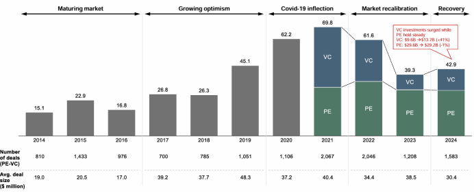 一、2024年市场复盘 (一)投资规模:结束两年收缩,VC成核心增长引擎 2024年印度PE-VC市场的复苏具有鲜明的“结构分化”特征:整体投资规模达430亿美元,同比增长9%,但增长动力几乎完全来自VC与成长型投资,PE投资则保持稳定。具体来看,VC与成长型投资在2024年实现爆发式增长,规模从2023年的约100亿美元增至140亿美元,同比增幅高达40%,这一增长主要由两方面驱动:一是交易数量的显著提升,VC交易数从2023年的880笔跃升至1270笔,增幅超44%;二是消费科技赛道的强势反弹,该领域融资规模翻倍至60亿美元,投资者更倾向于布局已实现规模化、盈利路径清晰的优质标的。 与之形成对比的是,PE投资在2024年保持稳定,规模维持在290亿美元左右,同比微降1%。PE投资增速放缓的核心原因在于估值预期差。受印度公开市场估值高企(NIFTY指数P/Eratio在2024年多数时间维持在22-24倍)影响,标的企业估值诉求较高,而PE基金对风险把控更为谨慎,导致部分交易因价格谈不拢而延迟或终止。 图1 印度私募股权与风险投资(PE-VC)年度投资额 ($ billion) 数据来源:Bain & Company; Venture intelligence; AVCJ: VCCEdge (二)区域地位:亚太第二大市场,全球资本配置优先级提升 2024年,印度进一步巩固了亚太地区第二大PE-VC投资目的地的地位,其投资规模占亚太区域总投资的比例达到20%,仅次于中国。《报告》数据显示,2024年亚太地区PE-VC总投资为746亿美元,印度以430亿美元的规模远超英国、日本等市场,成为全球资本在新兴市场的核心配置方向之一。这种地位的提升源于全球投资者对印度宏观经济稳定性的信心:2024年印度GDP增速保持在6.5%以上,通胀逐步回落至央行目标区间(4%±2%),加之政府持续推进的结构性改革,共同构建了高增长、低波动的投资环境。 (三)交易结构:并购成PE主流,小额交易驱动VC活力 在交易类型上,2024年印度PE市场呈现并购主导的显著趋势,并购及多数股权交易占PE总交易价值的比例在2024年达到51%,首次超过半数,标志着印度PE市场从少数股权投资向控制型投资转型。基金选择并购模式的核心逻辑在于价值创造确定性,通过收购高优质资产的控股权,更深入地参与企业运营,通过优化管理、拓展市场、整合资源等方式提升资产价值。 从交易规模分布来看,2024年市场呈现小额交易驱动活力,大额交易支撑规模的特点。一方面,小额交易(单笔规模低于1亿美元)数量同比增长40%,占总交易数的70%以上,重点集中于VC领域,覆盖消费科技、早期医疗健康等赛道;另一方面,大额交易(单笔规模超1亿美元)数量保持稳定,2024年共完成101笔,主要集中在PE领域且多为并购交易。 二、聚焦四大赛道,传统与高增长领域协同发力 一是房地产与基础设施赛道。2024年,房地产与基础设施赛道以16%的占比成为印度PE-VC市场第一大投资领域,交易价值同比激增70%,规模达到约69亿美元。这一增长主要由基础设施投资和房地产投资两大板块驱动。其中,基础设施领域投资的核心推动力是ATC印度业务收购案、印度政府的国家高速公路网络扩张计划以及PPP模式的成功推广;房地产的核心增长点是住宅地产,主要原因是后疫情时代居民对居住空间需求的提升、一线城市豪华住宅占比的提升、、政府保障房政策的支持。此外,商业地产与仓储地产也保持稳健增长。 二是金融服务赛道。2024年,印度金融服务领域PE-VC投资规模同比增长25%,达到约54亿美元,成为市场第二大投资领域,该赛道的增长源于资产结构的优化:基金从过去偏好的无抵押零售贷款转向高收益、低风险的风险资产,具体包括保障房融资与物业贷款(LAP)、MSME贷款和财富与资产管理三大方向。 三是医疗健康赛道。2024年,印度医疗健康领域PE-VC交易数量同比增长80%,投资规模达约47亿美元,成为市场量价齐升的典型赛道,其赛道的增长主要由医疗科技、制药企业、医疗服务提供商三大细分领域驱动。 四是IT与IT服务赛道。2024年,印度IT与IT服务领域PE-VC投资规模同比激增300%,达到约52亿美元,成为市场增长最快的赛道。这一爆发式增长主要由大额并购交易、医疗收入周期管理(RCM)两大因素驱动。核心是全球企业数字化转型需求持续,印度IT服务企业凭借“成本优势+技术人才储备”占据全球市场份额;全球离岸外包机遇,印度企业在医疗编码、账单管理等领域的服务质量全球领先,未来增长空间巨大。 三、募资与退出 2024年,印度PE-VC募资市场呈现“本土基金创纪录、全球基金加配”的繁荣景象,进一步巩固了其“亚太核心募资目的地”的地位。在本土基金方面,实现了规模与质量的双突破;在全球基金方面,全球头部PE-VC基金将印度列为“长期战略配置”方向,2024年纷纷宣布加码计划,以长期主义为导向,加速了资源配置。值得注意的是,2024年募资市场的竞争也日益激烈,2016-2024年印度活跃PE-VC基金数量增长60%-65%,达到170-180家。 2024年,印度PE-VC退出市场迎来“丰收年”,规模与交易数量均创历史新高,为基金回报LP提供了有力支撑。2024年印度PE-VC退出总规模达330亿美元,同比增长16%;交易数量达360笔,同比增长8%,均为历史最高水平。其中,2024年公开市场退出占总退出价值的59%,以公开市场为绝对主导,具体包括IPO退出和大宗交易两大方式的退出。从赛道分布来看,2024年退出主要集中在三大领域:金融服务、医疗健康(60亿美元,同比下降4%)、消费/零售。 四、2025年展望 《报告》对2025年印度PE-VC市场的整体判