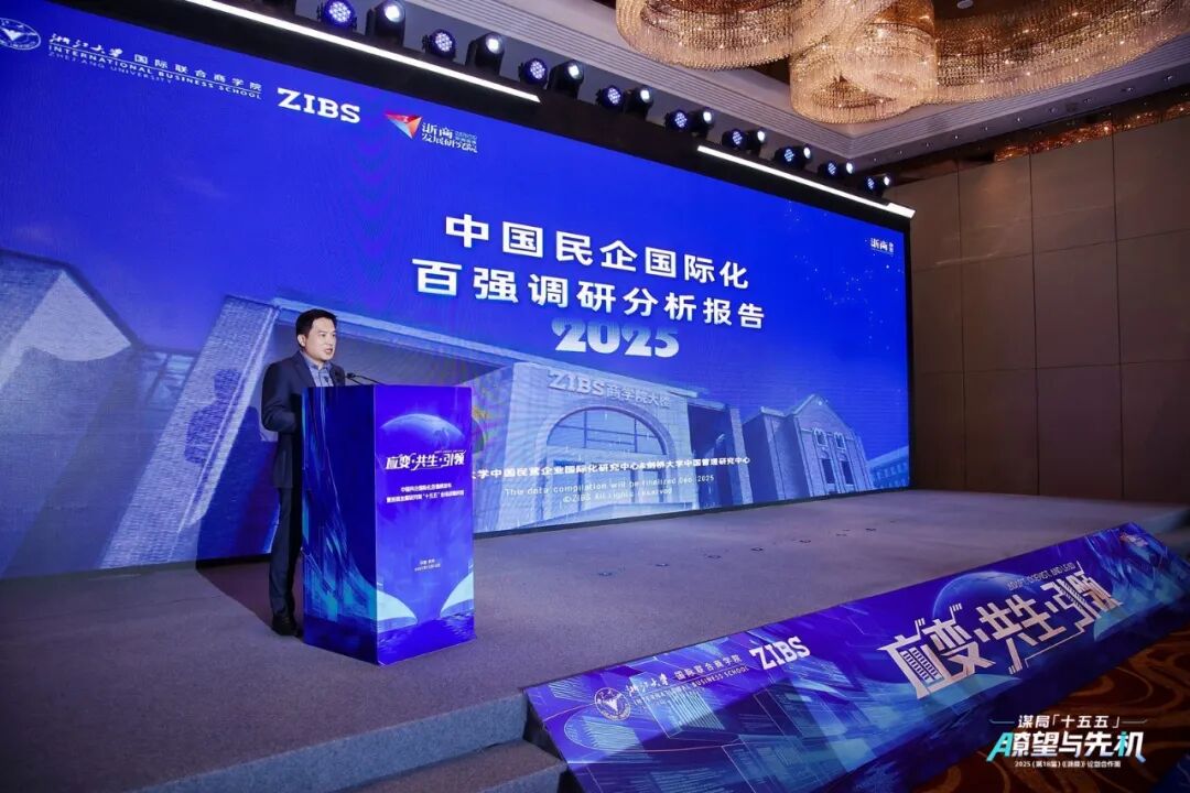 中国民营企业国际化研究中心 中国民营企业国际化研究中心( CCM)由北京前沿金融监管科技研究院(FIRST)与浙江大学国际联合商学院(ZIBS)合作运营,围绕民营企业国际化发展等领域开展前瞻性的学术研究,并以政产学研融合创新的方式,提供教育培训、课题调研、企业咨询等社会服务,致力于打造以民营企业、民营企业家为主要服务对象的专业化智库平台。 12月12日,“应变·共生·引领——中国民企国际化百强榜发布暨浙商智库‘十五五’全球战略对话”论坛在杭州顺利举办,中国民营企业国际化研究中心(CCM)于活动中发布《2025中国民企国际化百强榜》。该研究由浙江大学国际联合商学院(ZIBS)联合剑桥大学中国管理研究中心、浙商发展研究院等机构共同推出,为民营企业国际化布局提供有力的决策参考。 On December 12, the forum “Adapt·Coexist·Lead—Top 100 Chinese Private Enterprises in Globalization Release” was successfully held in Hangzhou, where the Center for Chinese Multinationals (CCM) released the 2025 Top 100 Chinese Private Enterprises in Globalization. The research was jointly conducted by ZIBS in collaboration with the Cambridge Centre for Chinese Management and the Zheshang Institute, providing valuable insights for the global expansion of Chinese private enterprises. 作为连续五年发布的重要研究成果,《中国民企国际化百强榜》已成为理解中国民营企业全球化发展的重要依据。北京前沿金融监管科技研究院院长、ZIBS院长贲圣林与中南集团董事局主席吴建荣、海亮集团董事长王黎红、浙江日报报业集团副总编辑邢晓飞、浙江省能源集团原董事长胡仲明、浙江省创投协会会长邱飞章共同登台,携手发布“2025中国民营企业国际化百强榜”。本次论坛聚焦“十五五”全球战略机遇,通过政策研判、趋势解读与实战分享,为企业“走出去”提供多维视角与启发。 浙江省政协原副主席、浙商发展研究院院长周国辉在致辞中强调,当前民营企业国际化发展面临复杂多变的外部环境,企业需紧密关注“天气变化”,强化预判与风险管理,提升应变能力。在不确定性增强的发展背景下,“走出去”的过程必然会遭遇各类风险与挑战,只有主动走出舒适区、拓展全球市场,才能实现更高质量的发展。 贲圣林则指出,“应变·共生·引领”不仅是论坛主题,更折射出当前时代的深刻变化。地缘政治重塑、数智化变革、绿色低碳转型与人口结构变化等多重趋势叠加,正在重塑企业发展环境。中国民营企业正加快从“制造”向“智造”、从本土走向全球的升级步伐。他强调,企业唯有把握趋势、持续创新、坚守价值,才能在全球市场中实现长期发展。 论坛上,CCM执行主任万峰对榜单进行了系统解读。他介绍,本次榜单基于“国际化规模、组织、创新与影响”四大维度构建量化指标体系。从行业来看,制造业仍是国际化百强的核心力量;从国际分布看,企业全球布局持续向东南亚、欧美等重点区域延伸;从区域分布看,长三角表现最为突出,浙江、广东等沿海省份保持强劲的国际化活跃度。 浙江省发展规划研究院副院长、浙商发展研究院高级顾问潘毅刚则对《2026经济趋势三原色》报告进行了深入解读。论坛同时设置了圆桌对话,聚焦国际循环、探讨全球战略,由万峰主持讨论,剑桥大学嘉治商学院教授、剑桥大学中国管理研究中心联席主任尹一丁,浙江省侨联副主席、意大利华侨华人友好协商会主席、浙商发展研究院高级顾问季志海,金田阳光投资集团董事局主席、浙商总会联席轮值会长金位海,以及千年舟新材科技集团股份有限公司执行总经理田茂华参加圆桌讨论,围绕民营企业全球化路径、世界级品牌打造、海外文化融合、国际人才战略及海外并购等中企国际化核心议题展开交流。 由浙江大学国际联合商学院(ZIBS)、浙商发展研究院(浙商智库)、中国民营企业国际化研究中心(CCM)、剑桥大学中国管理研究中心,联合《浙商》杂志共同发起的“十五五”战略国际化企业“陪跑计划”也于现场正式发布。期待未来在多方携手之下,整合一流学术资源、产业洞察、全球网络与媒体平台,构建一个长期、深度、可定制的“陪跑赋能”体系,并沉淀具有中国特色的国际化理论成果与实践。 论坛以“2025中国民企国际化百强”颁奖为结尾,期待未来一同见证更多中企在“十五五”的全球化征程中,应变有道、共生共赢。ZIBS也将继续与中企共同探索民营企业国际化发展新路径、推动构建开放包容的全球商业新生态。CCM将联合《浙商》杂志推出系列专题报道,深入探访百强企业的故事,敬请期待! END